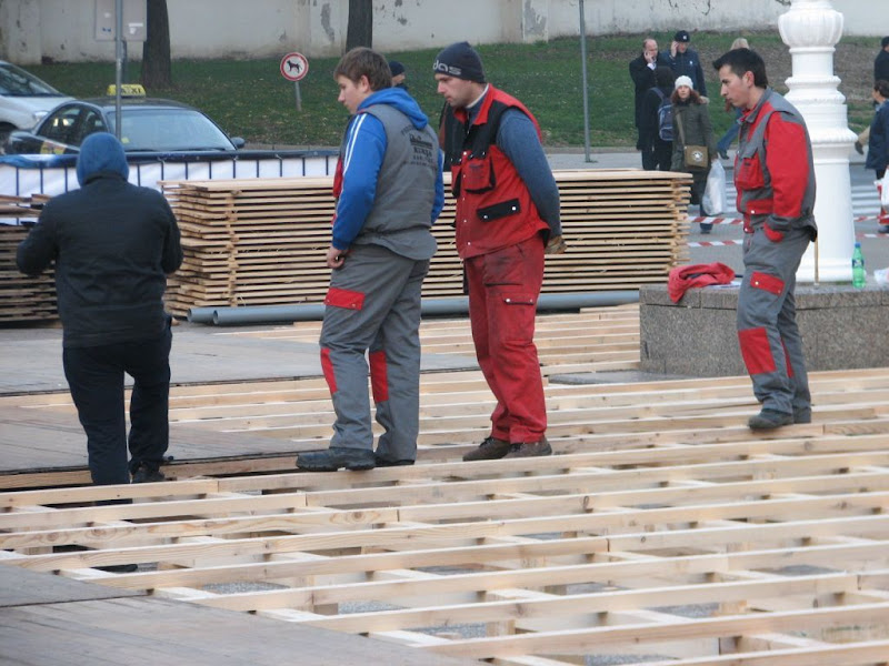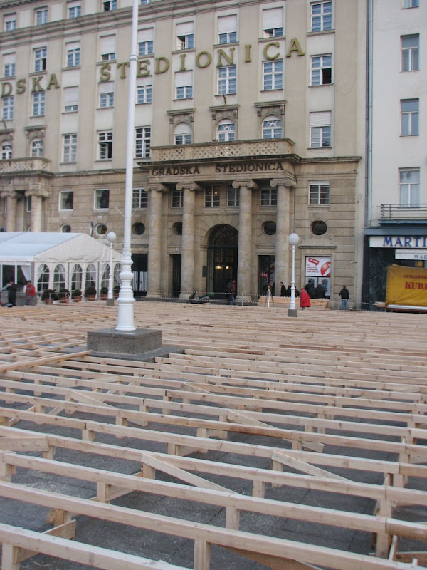 U trenutku kad ovo pišem (subota popodne) još uvijek ne znam kakva je velebna građevina bila u gradnji na istočnom kraju Jelačić placa (čini se, pozornica), no prekjučer (četvrtak, 25.11.) je bilo zanimljivo pogledati nastajanje njezinih temelja, neobične “paukove mreže” od drvenih greda i letvica. Za koji dan će sve to nestati s vidika prolaznika i biti će prekriveno prigodnom prazničnom “fasadom”, a vi se tad sjetite što se nalazi iza kulisa!