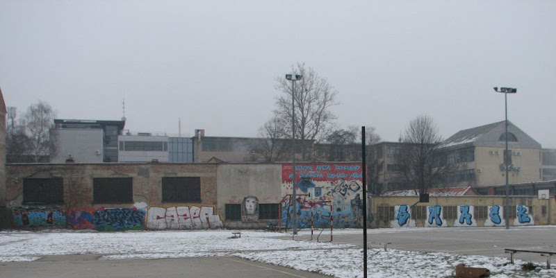 Jučer sam vam napisao nekoliko riječi o bloku stambenih zgrada pored Prešernove ulice, a danas ćemo se pomaknuti nekoliko desetaka metara sjeverozapadno i posjetiti školsko igralište osnovne škole Ivana Cankara. Igralište je dostupno svima jer ograda gotovo da i ne postoji i vidljivo je da ga posjećuju svi koji to žele. Sa južne trane je ograđeno zidom tekstilno tehnološkog faksa koji je postao savršeni poligon za graffitere, dok su zapadna i sjeverna strana odijeljena onim dobro poznatim izgledom zabačenih gradskih zakutaka, mješavinom stare ograde, grmlja, korova i kojekakvih baraka. Dakle – ponovo plodno tlo za zidne risarije. A što se samih uradaka tiče, rekao bih da su iznad prosjeka što se takvih mjesta tiče – pogledajte sami kakva je bila situacija krajem 2010. godine.