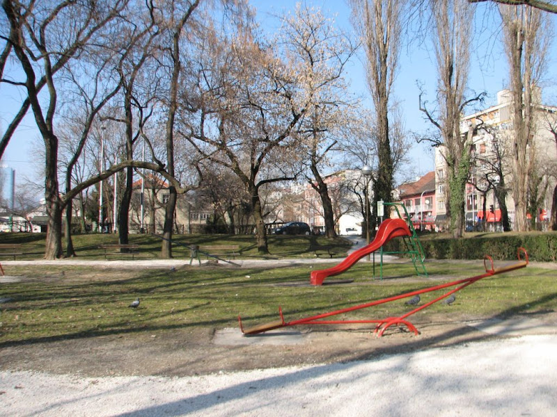 No, čini mi se da su ta vremena prošla i za mojih povremenih posjeta parku tokom zadnjih godina on se činio beznadno praznim i napuštenim – ne sjećam se da li sam ikad vidio ikoje dijete na njegovim njihaljkama i toboganu, čak se ne sjećam ni prizora pijanaca, tek ponekog dokonog čitača novina ili besciljnog sjedioca na klupi. A toj čudnoj atmosferi parka doprinosi i uljez sa istočne strane – benzinska pumpa “INE” koja je tamo tko zna otkad, od pamtivijeka. I tako je to park sa dječjim igralištem na kojem ne možete sresti dijete, ali zato na njemu, parku, možete nataknkati auto .. ili, kao što velika većina Trešnjevčana radi, samo ga pogledati iz tramvaja ili sa zebre kojom se prolazi od “Konzuma” ka placu i obratno.
