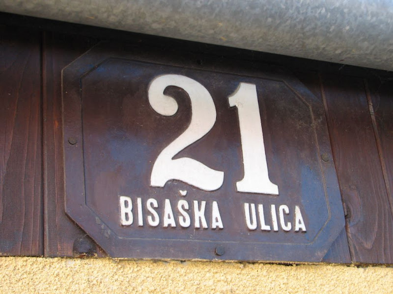 Kako se zove ta ulica, pitate se sad vi, a i ja s vama. Naime, natpisne ploče i ploče sa kućnim brojevima naizmjence sugeriraju da se tu radi o Bisačkoj ulici, a dijelom da je to Bisaška ulica.