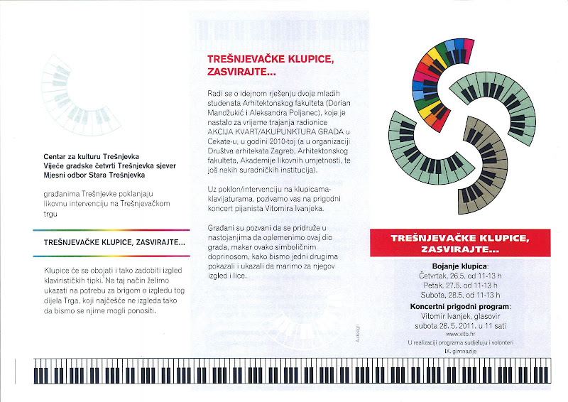 A kako je u stvari ta klupa dobila svoju muzičku odoru? Za vrijeme trajanja radionice “Akcija Kvart/Akupunktura grada” u organizaciji Centra za kulturu Trešnjevka 2010. godine dvoje mladih sudionika akcije, studenata Arhitektonskog fakulteta, Dorian Mandžukić i Aleksandra Poljanec, došli su na ideju bojanja klupe u stilu klavirskih tipki. I, pred nekoliko dana, ponovo u organizaciji CeKaTe-a, došlo je i vrijeme da klupice zabljesnu u bojama klavijature: drvene letvice su prvo očišćene i ošmirglane, zatim prebojane, a prošlu subotu, 28.05.2011. svečano su i puštene “u rad” prigodnim koncertnim programom pijaniste Vitomira Ivanjeka.