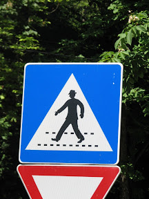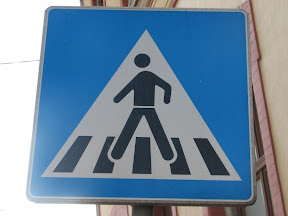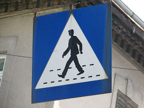 No, samo desetak metara uvis nalazi se na držaču tramvajskog voda vjerojatno od svih zaboravljeni znak iz 80-tih: kao što vidite, ovaj pješak ima detaljniju konturu glave, dlanove, zamjećuje se obris jakne ili sakoa, a čak mu se razaznaju i potpetice na cipelama (srednja fotka)