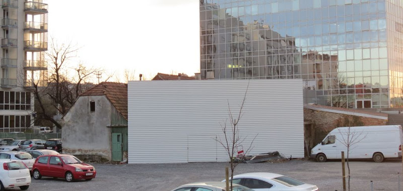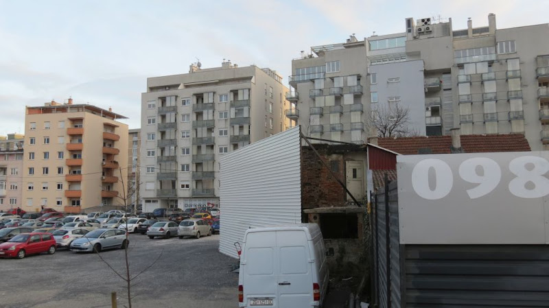 Na tom velikom ništa se sad nalazi parkiralište, vjerojatno za stanare i korisnike obližnjih zgrada, no kako bi ih poštedili suvišnog stresa vlasnici parkirališta su uz još jednu preostalu trošnu kuću podigli visoku metalnu “kulisu” … možda samo da prikriju pogled na jadnu kuću koja se jedva drži u jednom komadu, a vjerojatnije da se osiguraju da se neki komad te kuće ne odroni na parkirane aute.