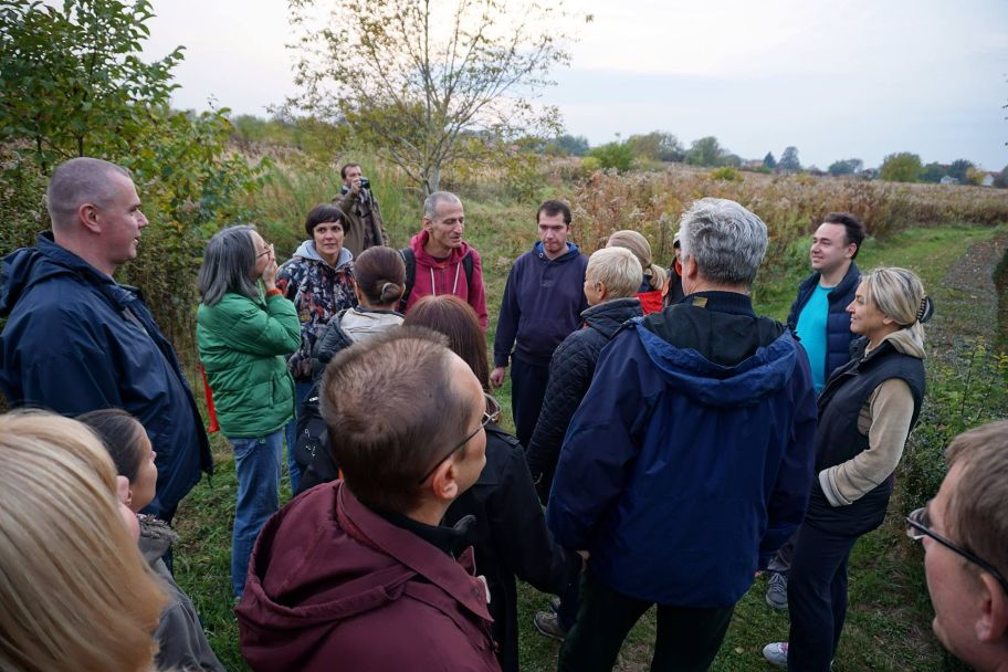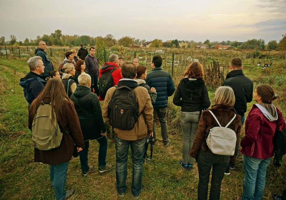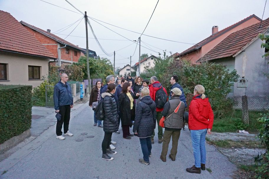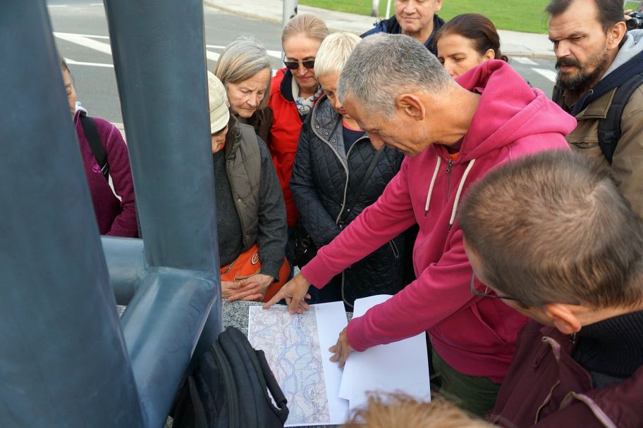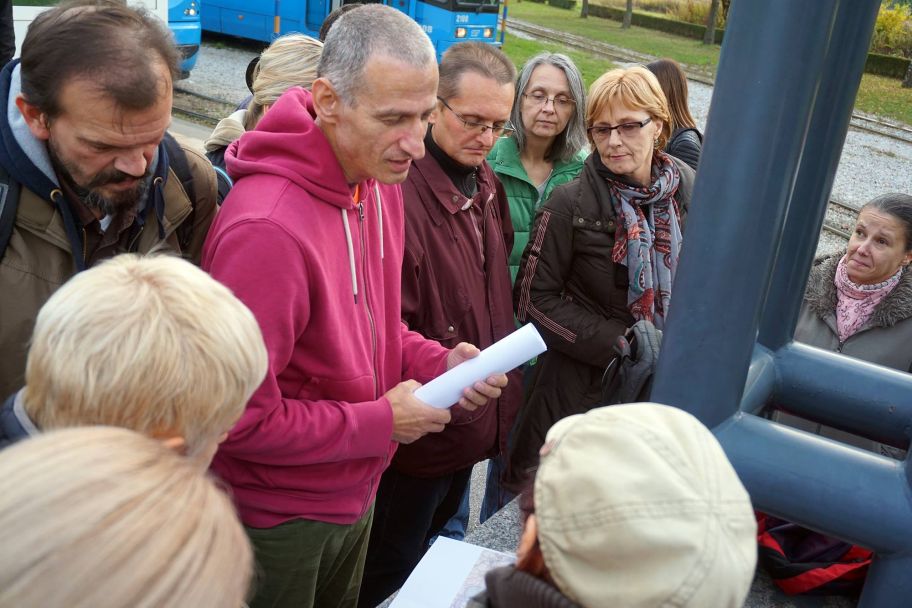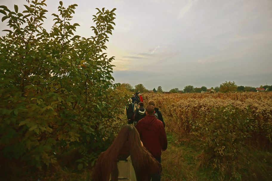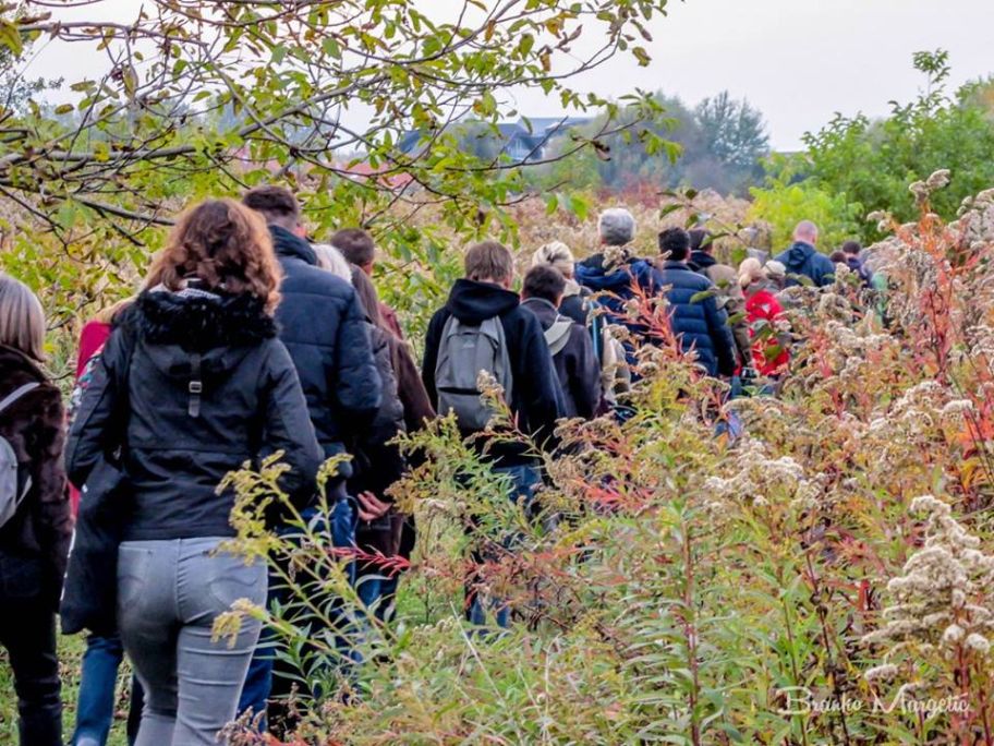 Šetnja je krenula u kasno popodne lijepog jesenskog dana, u petak, 14.10.2016., u 17:30 na okretištu tramvaja u Prečkom sakupilo nas se 27 i nakon kratkog uvoda uz tradicionalno pregledavanje starih karata krenuli smo u polje. Stazicom kroz visoku travu stigli smo na poljski put koji vodi uz gradski zajednički vrt Savska Opatovina, a taj je poljski put značajan po tome što je on zapravo granica između gradskih četvrti Trešnjevka Jug i Stenjevec. Tim smo se “graničnim područjem” prošetali prema jugu uočavajući mnoge napuštene parcele koje su nekad bile polja, a jedna od ograđenih (sada posve zarasla u korov) je u vlasništvu obitelji “bugara” koja još uvijek stanuje u Paljetkovoj ulici, no zbog starosti ju više ne obrađuju. Usput smo primjetili i valovitost tla koje svoje postojanje duguje riječnim rukavcima. Nakon izgradnje nasipa rukavci su izgubili vezu sa maticom rijeke (vjerojatno ih je inače Sava plavila za vrijeme visokih vodostaja i davala im vodu) pa su se isušili.