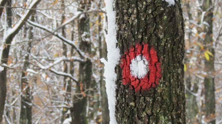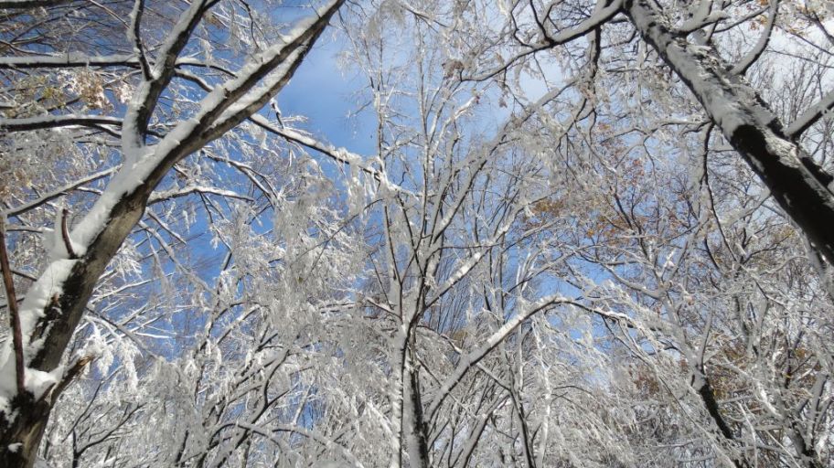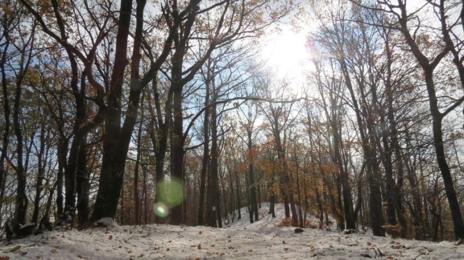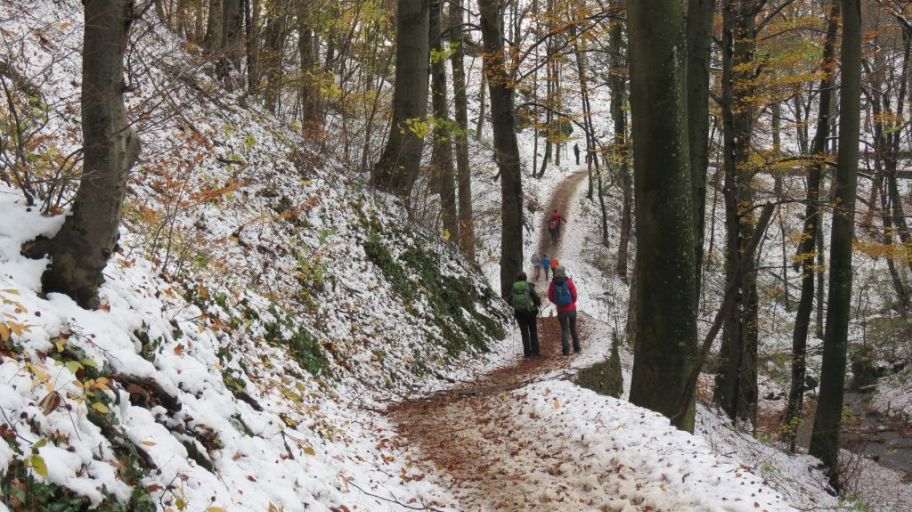 Nakon slijedećih 20 minuta uspona snijega je već bilo posvuda osim na samoj stazi gdje su ga prvi hodači već istopili svojim cipelama. No, prava stvar čekala nas je još malo više – na zaravni na oko 600 metara nadmorske visine odjednom je ispred nas i oko nas iskrsnuo pejzaž kao sa božićnih razglednica: snježni grumeni bili su po svim granama i na još neotpalom lišću (neko je čak još bilo i zeleno!) dok se na dnu više nije razaznavao šareni tepih .. ušli smo u zagrljaj zime!