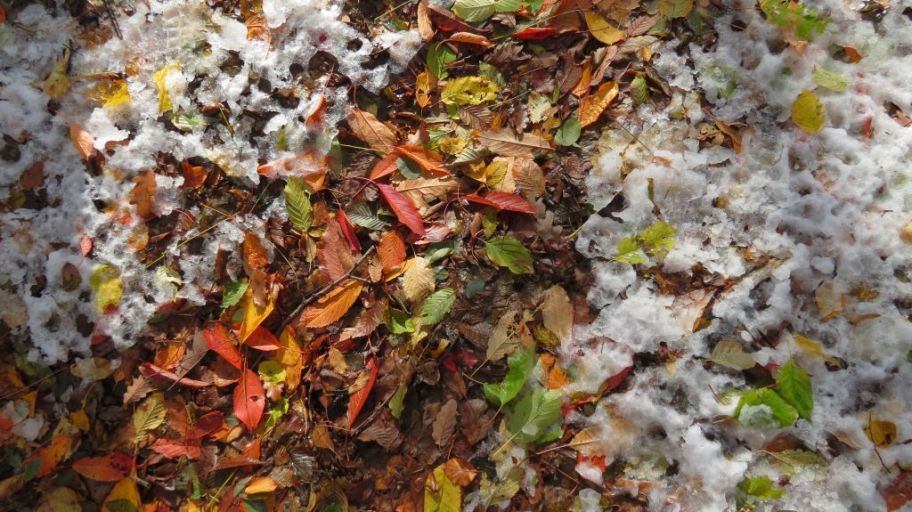 Bio sam jučer sa sinom i prijateljima u poludnevnom posjetu Medvednici. Krenuli smo od Šestina Putem prvog pohoda HPD-a i iako smo znali da na vrhu, na Sljemenu, ima 33 centimetra snijega na početku našeg puta je ugođaj još bio posve jesenski: šareno lišće po tlu, ali još i po drveću, tu i tamo bile su na stablima neobrane jabuke, usprkos najavama nije bilo još ni mraza … I tako smo mi napredovali uzbrdo po šarenim lišćem pokrivenim stazama dok nismo iznenada spazili prve tragove snijega. Prvo su to bile male hrpice, jedva vidljive … nakon 15-tak minuta hoda već je cijelo tlo bilo pokriveno sa 2-3 cm zrnatog snijega ispod kojeg se još posve jasno vidjela šarena lisnata podloga.