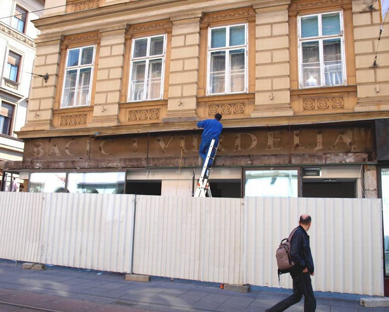 Kad su radnici skinuli već nekoliko desetaka godina stari reklamni natpis “Mladosti” (ah, nema više onog njihovog zelenog natpisa i ptičica na knjizi na njihovom logotipu …!) ispod njega je izvirio još stariji natpis na fasadi na kojem se sasvim razumljivo može pročitati “Bačić i Vurdelja”. Kratka potraga po webu je rezultirala informacijom kako je ta zgrada nekad pripadala Srpskoj pravoslavnoj crkvi, a dotična trgovina “Bačić i Vurdelja” je navodno bila jedna od uglednijih trgovina tkaninama u Zagrebu prije Drugog svjetskog rata.