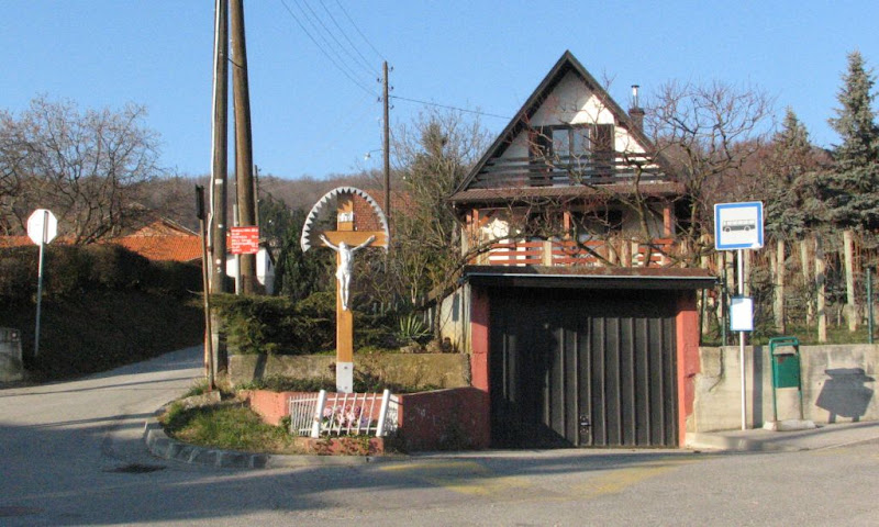 Centar Perjavice: Sve je tu – autobusna stanica, raspelo, početak planinarske staze. Samo još nedostaje neka gostionica (u tom dijelu nismo zapazili niti jednu) ili dućan (malo niže je trgovina “Snjeguljica” kod koje se očito okuplja lokalno stanovništvo) ispred kojeg bi bilo moguće popiti pivu ili pojesti sladoled. Snimio: Vanja