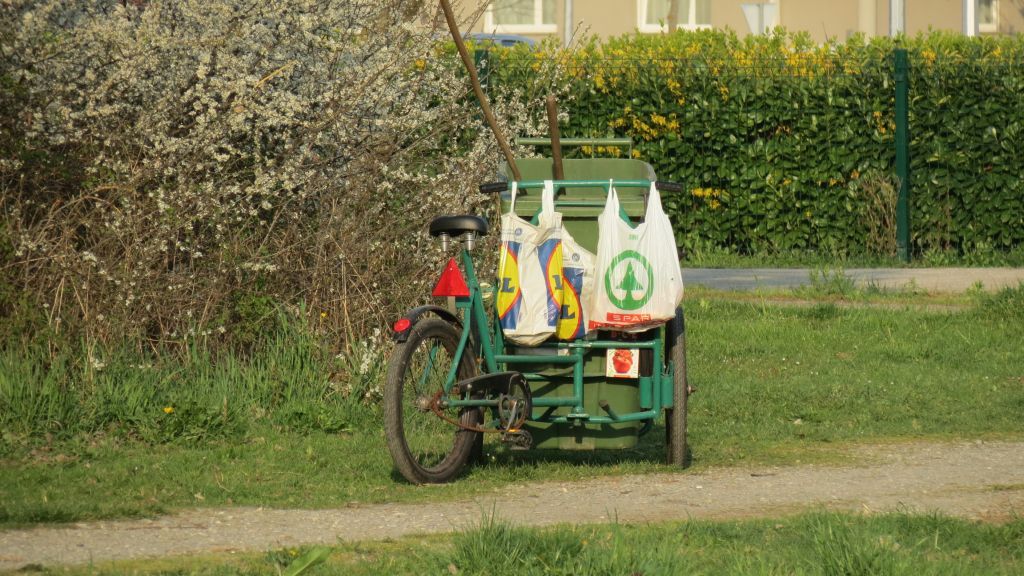 Zanimljivo sa vrećicama u koje vjerojatno stavlja nađene boce i stari kruh. Da li mu je zahrčao zupčanik bicikla?