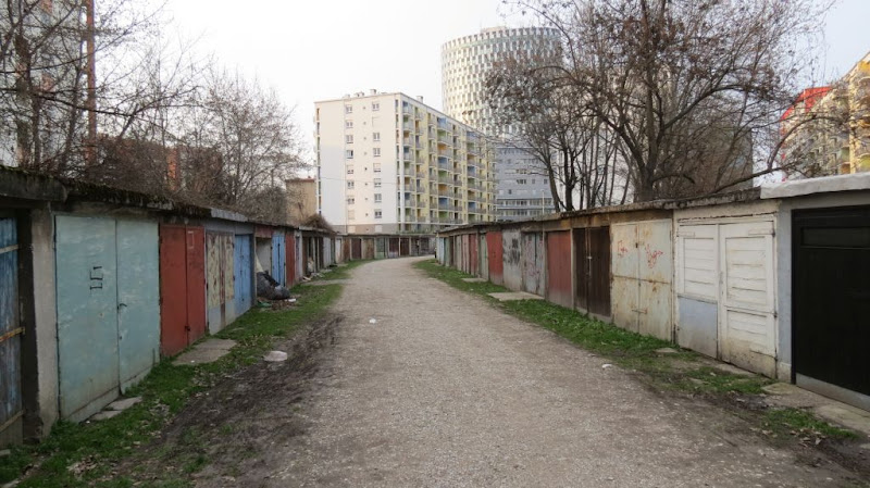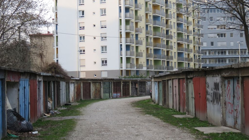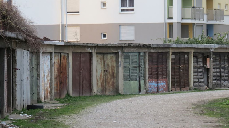 Neki od najžešćih prizora sraza različitih gradskih svjetova se mogu vidjeti u gradskim kvartovima koji su nekad bili predgrađa, a sada su epicentri gradnje. Na Trešnjevci, Trnju, Peščenici … sve vrvi od prizora malih obiteljskih kućica pored kojih se nalaze megalomanske građevine najnovijeg doba. No, zanimljivo je pogledati i suočenje prvog vala urbanizacije (iz 50-ih i 60-ih) sa najnovijom arhitekturom, a dobar primjer za to je okolica Folnegovićeve ulice sa brojnim novogradnjama uz koje još uvijek stoje razbacani ostaci nekadašnjih vremena … kao što je, na primjer, ovaj biser, niz garaža koje su nekim čudom još opstale u tom svijetu suvremenih zgrada!