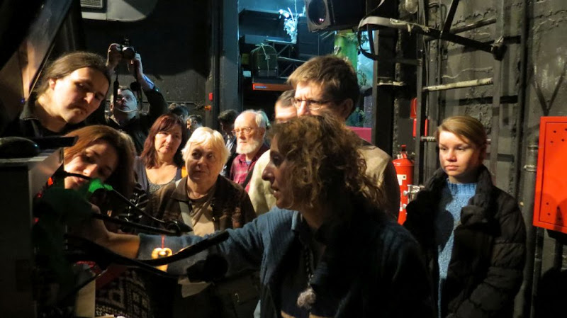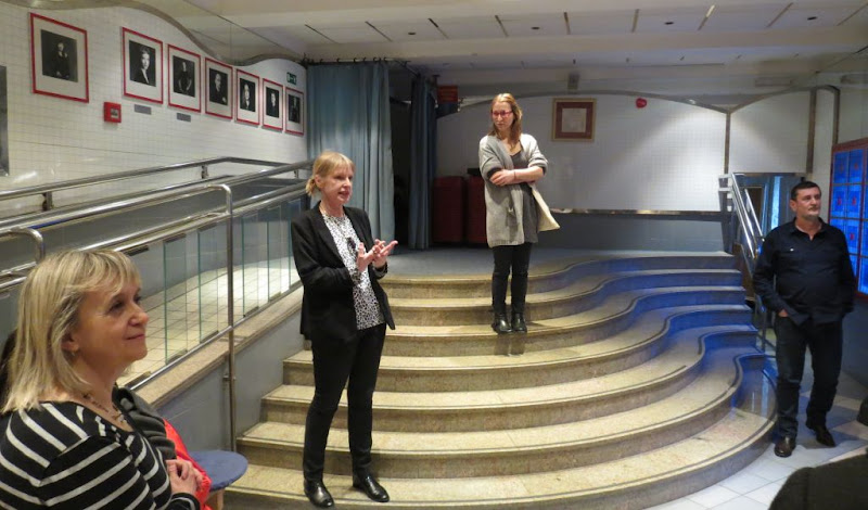 I, sastadosmo se mi, skupina ljubitelja otkrivanja Trešnjevke, nas 17, u kišno i hladno popodne ispred kazališta Trešnja u Moščeničkoj ulici gdje smo u ime projekta “Mapiranje Trešnjevke” zakazali susret sa našim domaćinima iz kazališta koji će nas provesti kroz svoj kazališni svijet slijedeći program nazvan “U kazalištu o kazalištu” koji već desetak godina školskoj djeci pokazuje drugu stranu kazališnog života. U kazališnom kafiću dočekala nas je šefica marketinga Kristijana, a ubrzo je stigla i ravnateljica Višnja Babić, inače dugogodišnja glumica tog kazališta koja je prije godinu i pol došla na njegovo čelo. Kako nam se sama predstavila, “Višnja koja radi u Trešnji, a najpoznatija je kao Dunja” (Dunja, cura Mazala Vrageca iz “Smogovaca”), u kazalištu radi još od 1986. godine i glumica je sa najdužim stažem u ansamblu. Ukratko nam je prepričala povijest kazališta sa posebnim osvrtom na doba kada su radili u CeKaTe-u čekajući dovršavanje njihove zgrade, na oduševljenje novom zgradom nakon useljenja, na program koji nudi klasična djela dječje književnosti s čim je moguće boljim produkcijskim uvjetima, na potrebu za radove na zgradi … Između ostaloga saznali smo i da kazalište ima 56 zaposlenih (od kojih 19 glumaca), da surađuju sa mladim glumcima, pokreću dodatne programe sa ciljem privlačenja publike kao npr. “Kazalište i knjiga” u čijem sklopu se u kazalištu prezentiraju nove knjige.