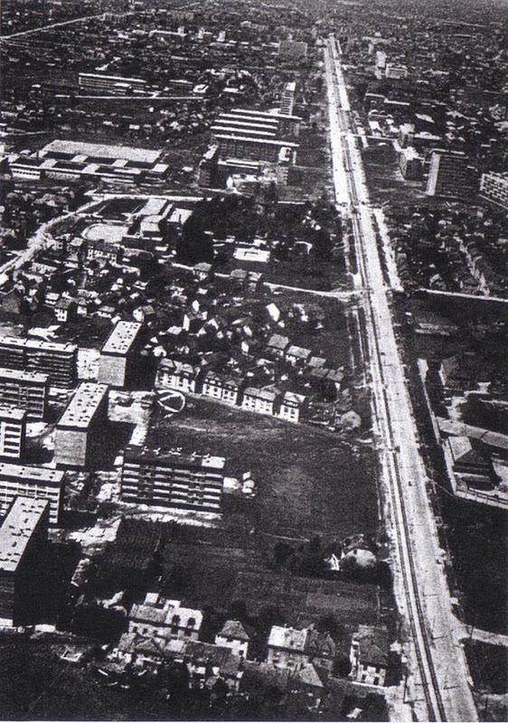 Uzdužni pogled na Ulicu grada Vukovara – uočite da još nije u cijelosti proširena.