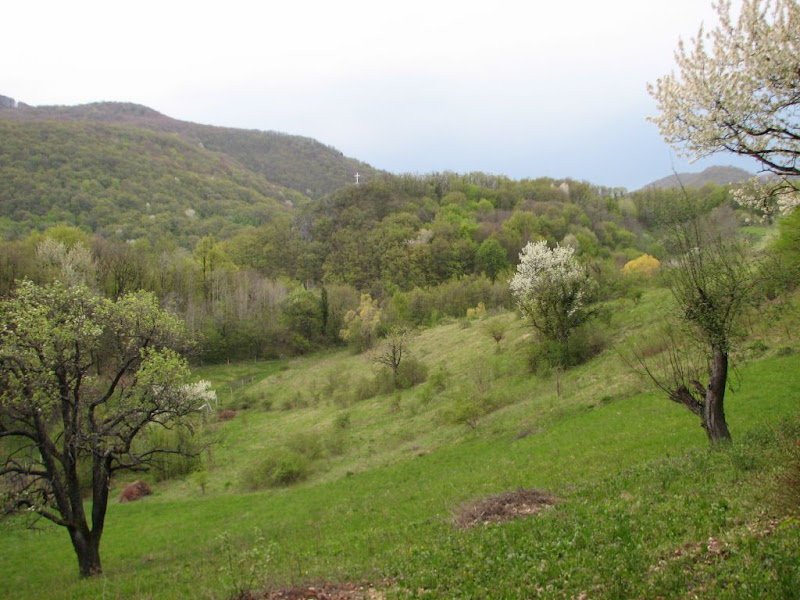 Razmišljao sam ne bih li dočekao uz križ i potpuni mrak ili barem paljenje svjetala javne rasvjete kako bih uživao i u takvome pogledu na selo … no, nki unutarnji osjećaj mi je govorio da je vrijeme za povratak. Isto tako, iako mi se pržala mogućnost da se vrtim drugim putem, kolskim putem nizbrdo, pa zatim dolinom prema školi, moj unutarnji osjećaj me je uputio poznatim putem. Napravio sam malo veći krug slijedeći kolski put do spoja sa markiranom stazom (po ostacima starih markacija bilo je vidljivo da je i taj kolski put kroz šumu nekad bio markiran) na samotnoj livadi okruženoj šumom. Već je bio sumrak (bilo je tamnije nego što pokazuje filmić), a pozicija livade koja je gledala od sela je blokirala sve seoske zvukove i šumska večrnja pjesma je tu bila najjača … čak sam čuo i prvog ovogodišnjeg zrikavca (na žalost, nije zabilježen na filmu …)
